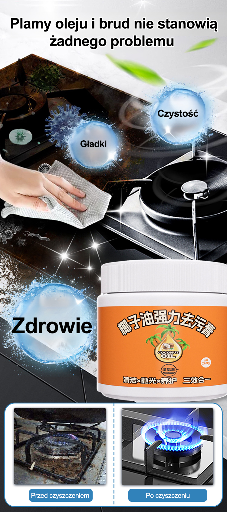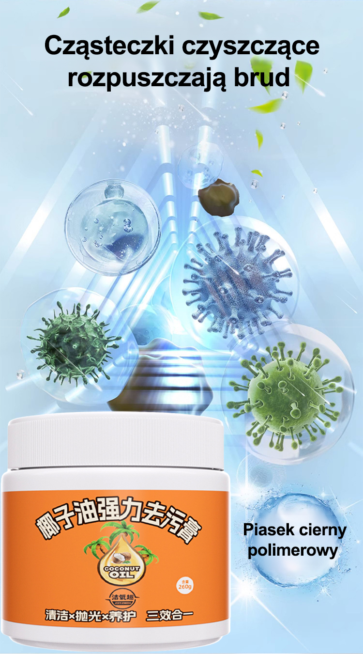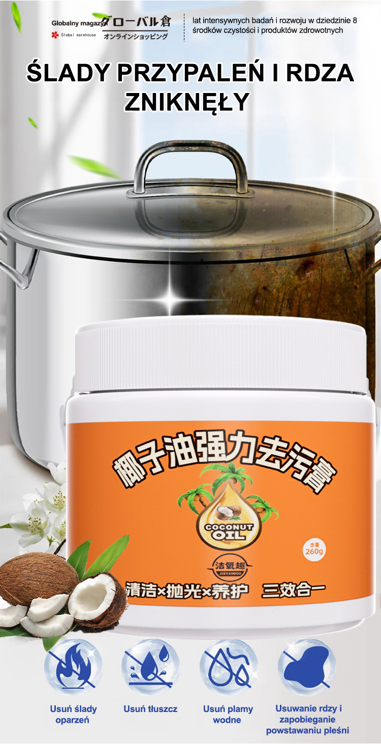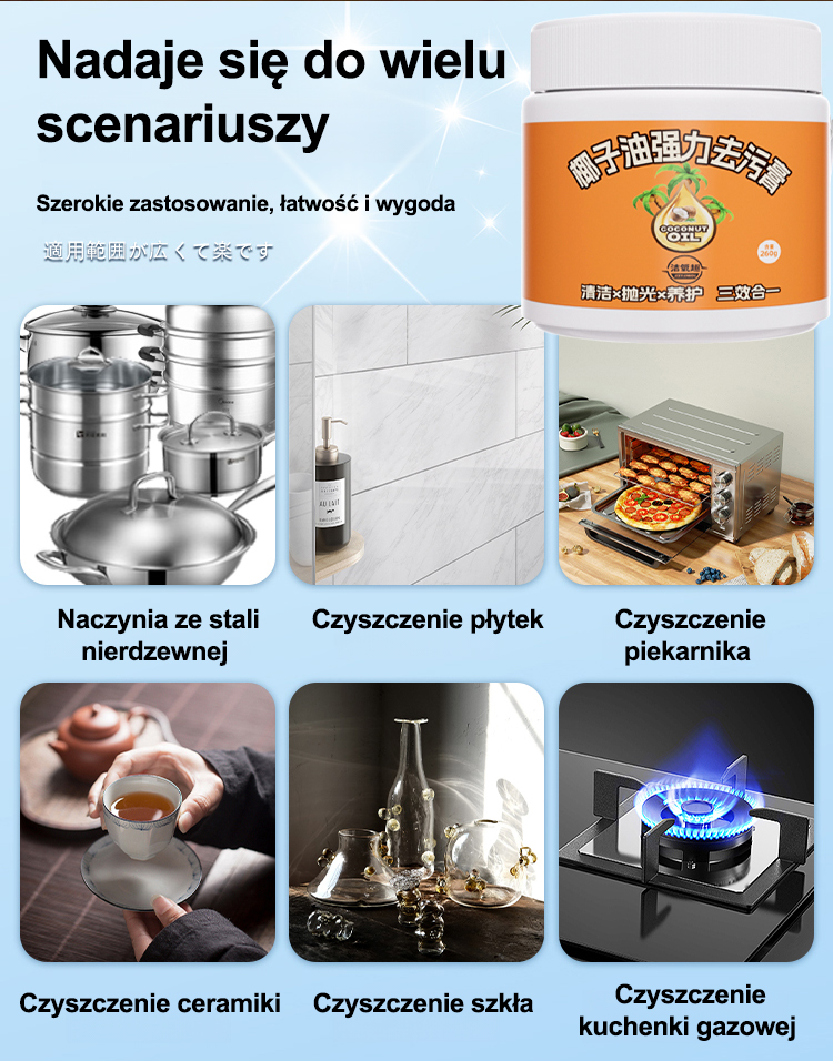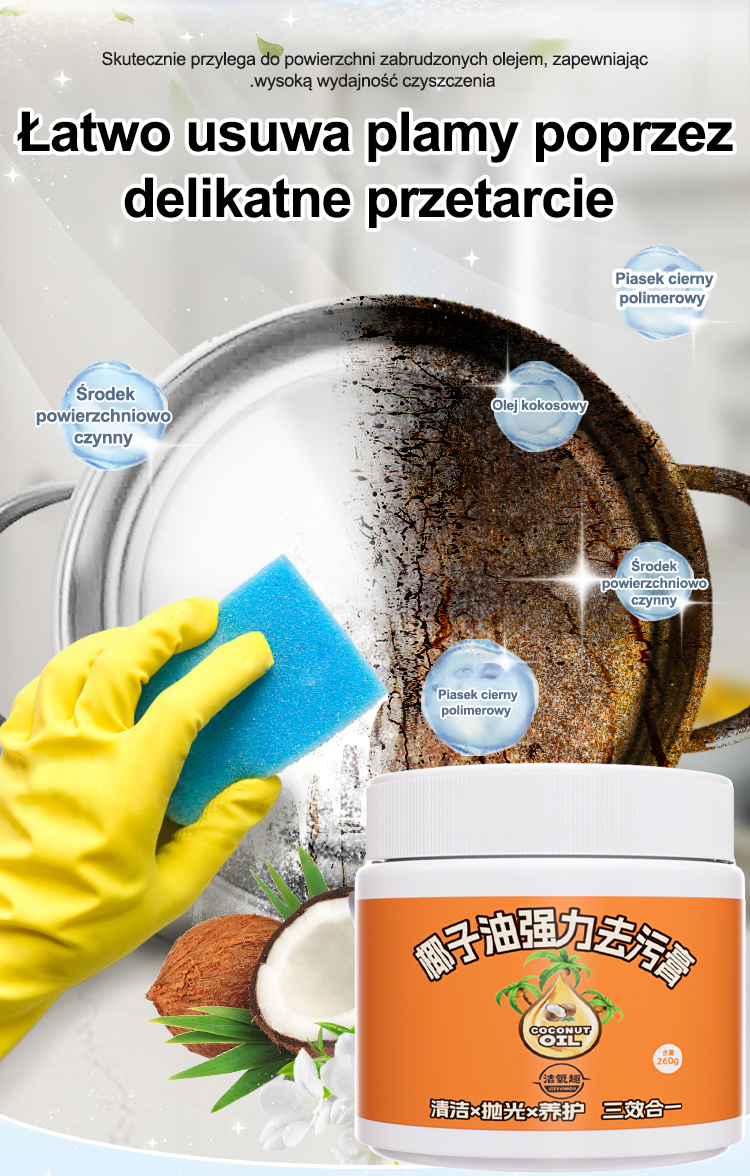 Oszczędź godziny na sprzątaniu. Naturalny olej kokosowy, bezpieczny dla Twoich dłoni.